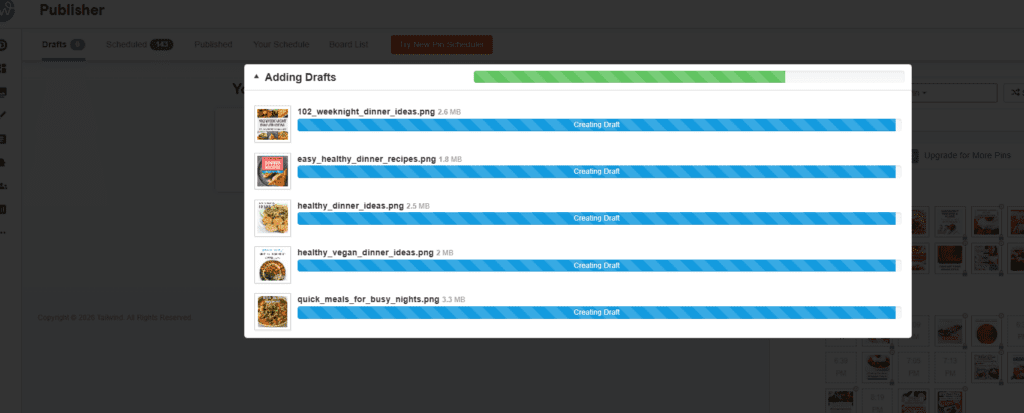 Upload multiple pin images, add titles and descriptions, and use the “Use Interval” feature in drafts to quickly assign them to various boards.