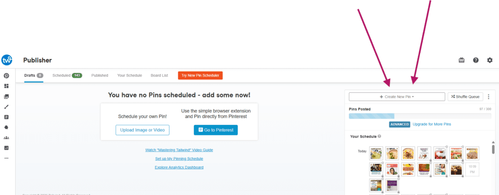 You can see that I have 0 pins in my drafts. To add your new pins, you’ll want to click on Create New Pin, where you can upload your pins.