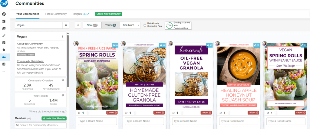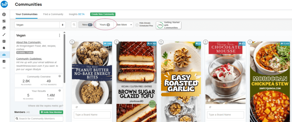 For example, in this image you can see we are part of a community named Vegan. We are fairly new to the community, and under “Yours,” you can see the amount of times our pins have been reshared.