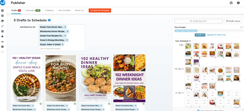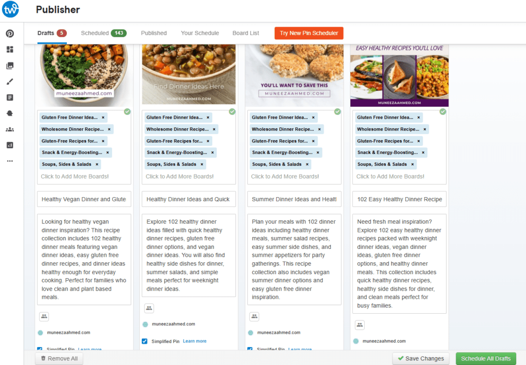 These tools allow you to group relevant boards, spread out pinning times to avoid spam, and schedule one pin to multiple boards in just a few clicks. I usually pin to 5 up to 10 boards.